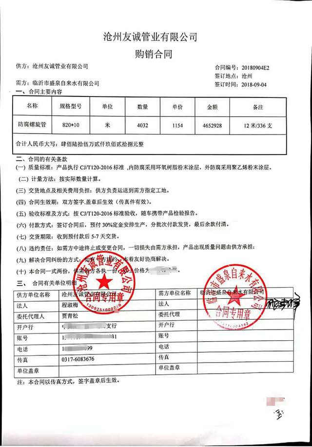 2018年9月我公司與沂州水務集團臨沂市盛泉自來水有限公司簽訂TPEP防腐螺旋鋼管購銷合同,DN800內外防腐鋼管4000米,感謝張總的信任,與貴公司的合同讓我們公司在自來水管道領域有了一個新的突破,歡迎各界領域客戶前來合作。